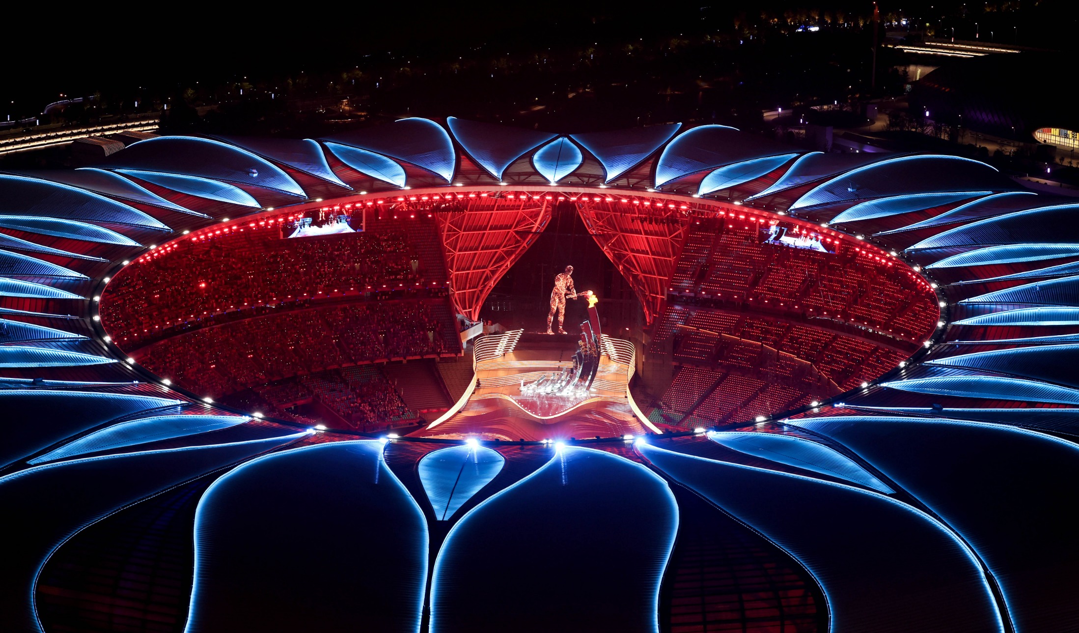 2023年9月23日,最后一棒火炬手汪順和數(shù)字火炬手在杭州亞運(yùn)會(huì)開幕式上點(diǎn)燃主火炬。新華社記者 程婷婷 攝