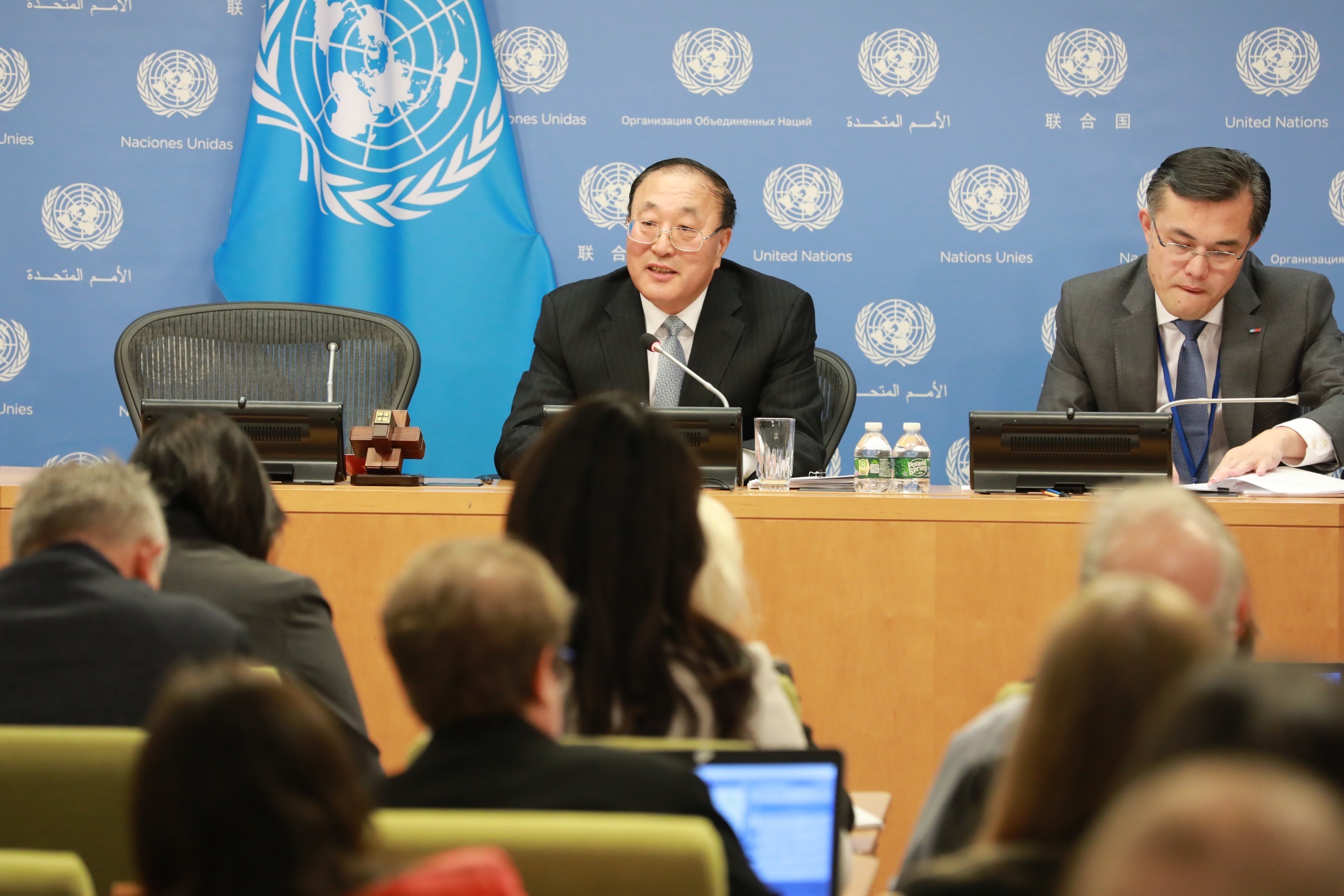 2023年11月1日,在位于紐約的聯(lián)合國總部,中國常駐聯(lián)合國代表張軍(左)在媒體吹風(fēng)會(huì)上講話。新華社記者 謝鍔 攝