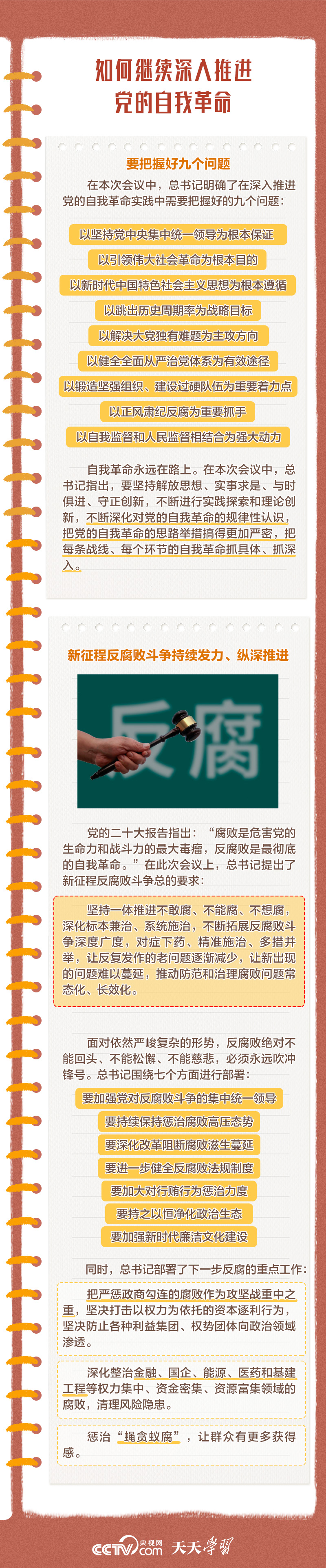 勇于自我革命是我們黨最鮮明的品格和最大的優(yōu)勢,總書記多次對推進(jìn)黨的自我革命作出重要部署。此次會議上,總書記深刻闡述了黨的自我革命的重要思想,明確提出需要把握好九個問題,并對持續(xù)發(fā)力、縱深推進(jìn)反腐敗斗爭作出戰(zhàn)略部署。央視網(wǎng)《天天學(xué)習(xí)》與您一起學(xué)習(xí)。