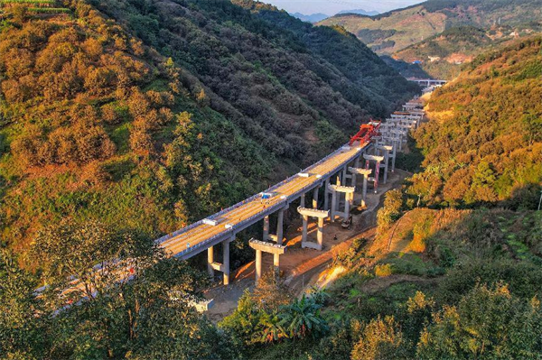 隆林樞紐立交橋,從航拍圖上看,通向四方的幾條匝道像是龍爪,主線似龍身,組成了猶如盤踞在山間的“龍”。在架設(shè)匝道T梁時,按照施工組織設(shè)計(jì),T梁從D匝道推進(jìn)到上跨汕昆高速公路單獨(dú)的鋼箱梁吊架是已經(jīng)合龍的。但架梁展開時意外出現(xiàn),鋼箱梁因其他原因未能到位——似乎成了考驗(yàn)魏玉“虎”能否撼動這條“龍”的試金石。魏玉虎應(yīng)急預(yù)案祭出:運(yùn)梁車把T梁運(yùn)到鋼箱梁附近,吊車把3跨梁吊架到鄰近D匝道的A匝道上,架橋機(jī)通過過渡工程,在A匝道繼續(xù)架梁;A匝道就成為關(guān)鍵線路,項(xiàng)目部立即集中火力搶做A匝道上的橋墩,確保架梁能繞道繼續(xù)前進(jìn)。這可以說“虎”勝“龍”。