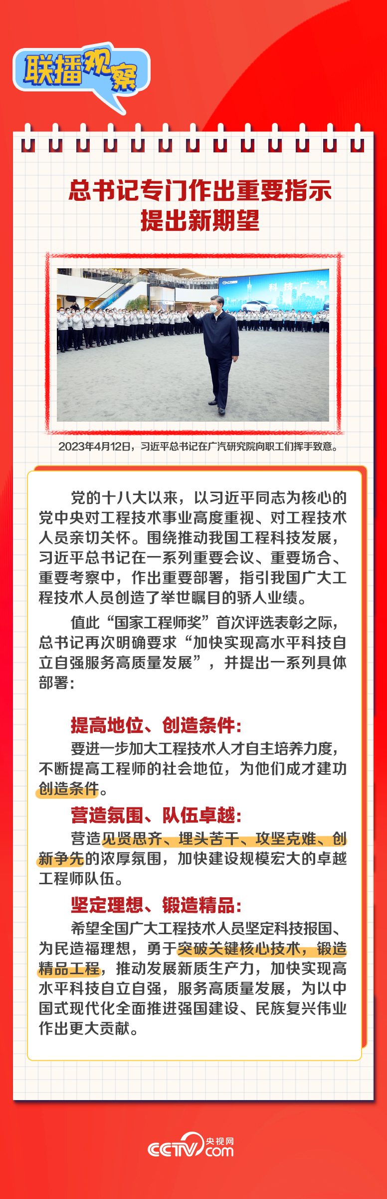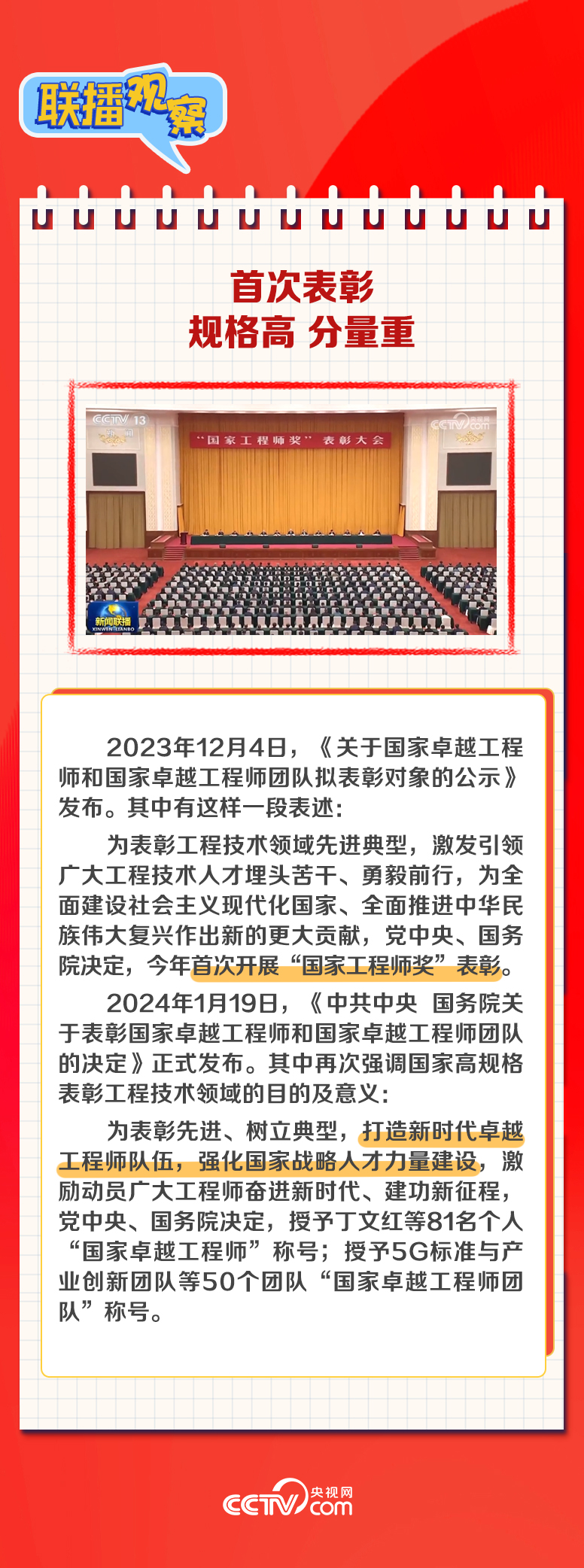 總書記對全國廣大工程技術人員提出哪些希望?獲獎者和獲獎團隊因何上榜?“國家工程師獎”獎章細節(jié)中藏著哪些奧秘?央視網(wǎng)《聯(lián)播觀察》帶您讀懂國家最高規(guī)格表彰工程技術領域先進典型背后的深意。