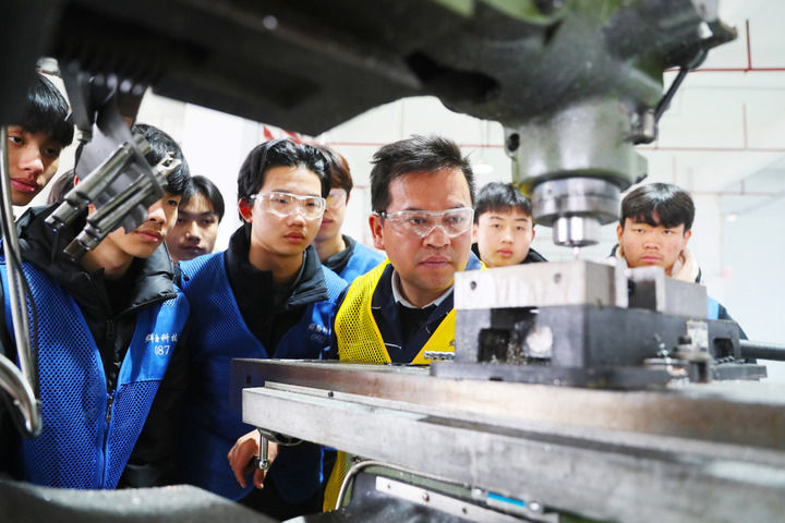 2024年1月9日,在湖南省永州市新田縣產(chǎn)業(yè)開發(fā)區(qū)永州群翰科技有限公司車間,新田縣職業(yè)中等專業(yè)學校學生在工廠師傅的指導下學習機床操作技術。近年來,該校聯(lián)合企業(yè)開展“產(chǎn)教融合、校企辦學”模式,助推就業(yè)創(chuàng)業(yè)。新華社發(fā)(劉貴雄 攝)