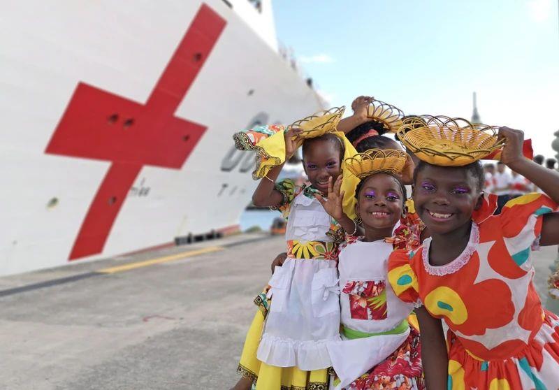 △2018年10月,在安提瓜和巴布達(dá)首都圣約翰,當(dāng)?shù)匦∨笥焉泶﹤鹘y(tǒng)服裝歡迎中國(guó)海軍“和平方舟”醫(yī)院船首次到訪。