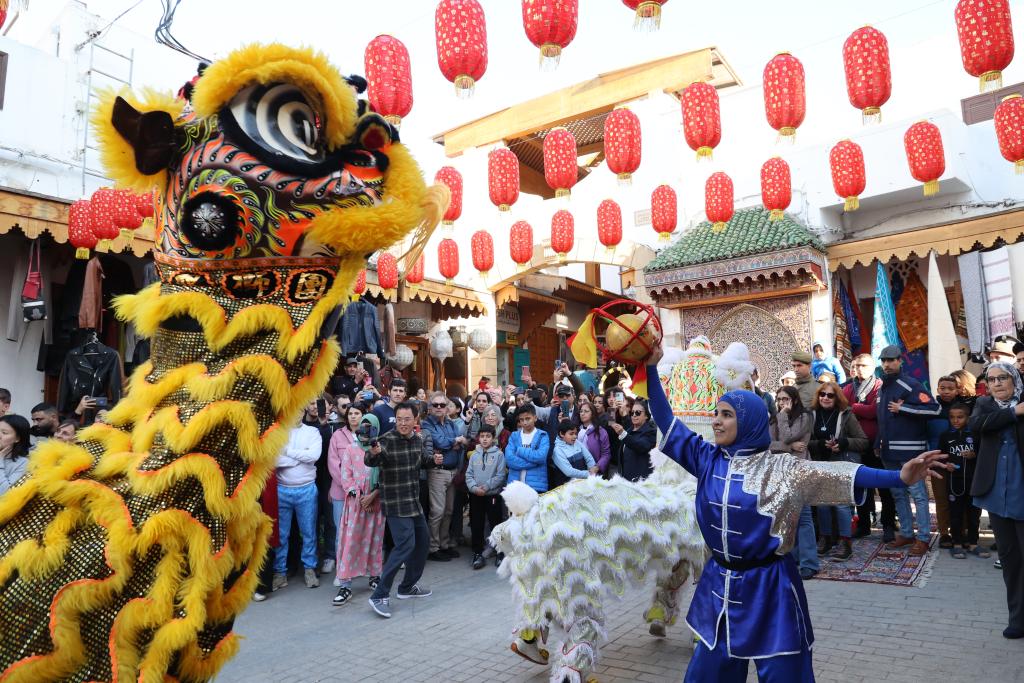 1月22日,人們在摩洛哥首都拉巴特老城里觀看舞獅表演。當(dāng)日,由中國文化和旅游部、中國駐摩洛哥大使館主辦的2024摩洛哥“歡樂春節(jié)·中國廟會”活動在摩洛哥首都拉巴特開幕,迎接即將到來的中國農(nóng)歷龍年春節(jié)。新華社記者 霍晶 攝