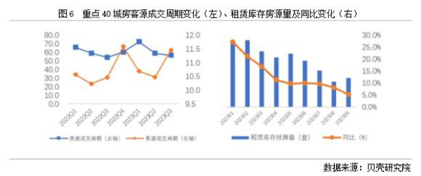 依據(jù)貝殼研究院數(shù)據(jù)監(jiān)測(cè),全國(guó)重點(diǎn)40城2023年三季度房客源成交周期分別為56.7、11.5天,房源成交周期環(huán)比減少2.1天,同比增加2.7天;客源成交周期環(huán)比延長(zhǎng)1天,同比延長(zhǎng)1天。隨著個(gè)人租賃房源供應(yīng)的增加,疊加保障性租賃住房、市場(chǎng)化集中式租賃房源的增加,個(gè)人業(yè)主出租房源出租速度減緩。從庫(kù)存房源來(lái)看,2023年1-9月租賃庫(kù)存房源量均呈現(xiàn)同比增加的趨勢(shì),與此同時(shí),租客租房面臨的選擇項(xiàng)增多,租客對(duì)于租賃房源可選類(lèi)型和房源量均有增加。