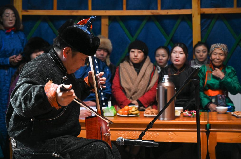 2023年12月21日,烏蘭牧騎隊員在阿其圖烏拉蘇木進行馬頭琴演奏表演。新華社記者 王楷焱 攝
