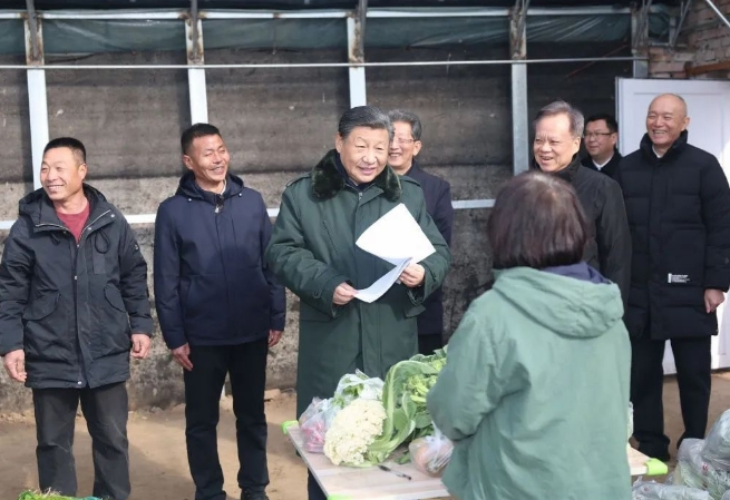 習(xí)近平握住一位農(nóng)民的手:“我們應(yīng)該感謝你們的辛勤勞動,豐富了春節(jié)的‘菜籃子’。”