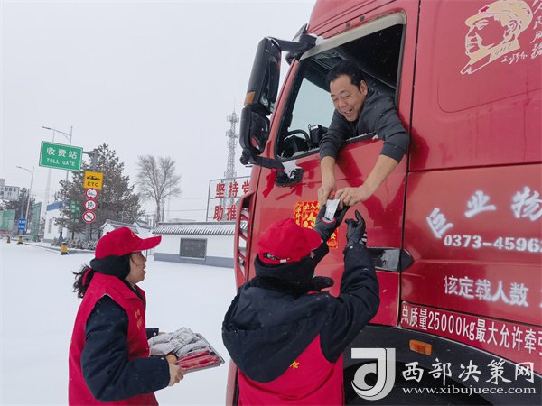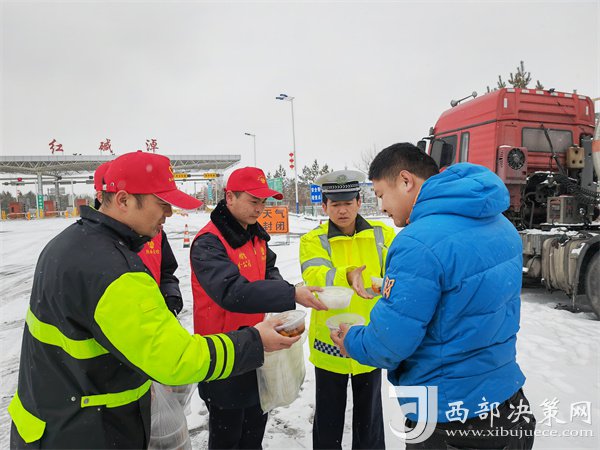 這有小米粥、炸油餅,雞蛋還熱乎著……”榆靖分公司志愿者暖心地喊著話。“行動是最好的破冰劑”,志愿者們?yōu)楦咚贉袈每退腿ナ澄?,頂風(fēng)冒雪分發(fā)給滯留在收費(fèi)站的司乘人員。一件件穿梭在寒風(fēng)中的“紅馬甲”此刻成為了冬日里最美的“志愿紅”,讓群眾在寒意逼人的天氣里感受到了一份特別的溫暖。大家紛紛表示感謝,“熱粥、小菜、松軟的饅頭下肚,全身都熱乎了。”一名滯留司機(jī)真誠地感激道。