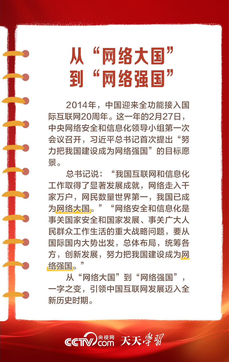 天天學(xué)習(xí) 黨的十八大以來,習(xí)近平總書記高度重視網(wǎng)絡(luò)強(qiáng)國(guó)建設(shè),在網(wǎng)絡(luò)強(qiáng)國(guó)建設(shè)實(shí)踐基礎(chǔ)上,提出了一系列新思想、新觀點(diǎn)、新論斷,形成了關(guān)于網(wǎng)絡(luò)強(qiáng)國(guó)的重要思想。在這一重要思想引領(lǐng)下,我國(guó)互聯(lián)網(wǎng)發(fā)展進(jìn)入全新時(shí)代,網(wǎng)絡(luò)強(qiáng)國(guó)藍(lán)圖徐徐鋪展。