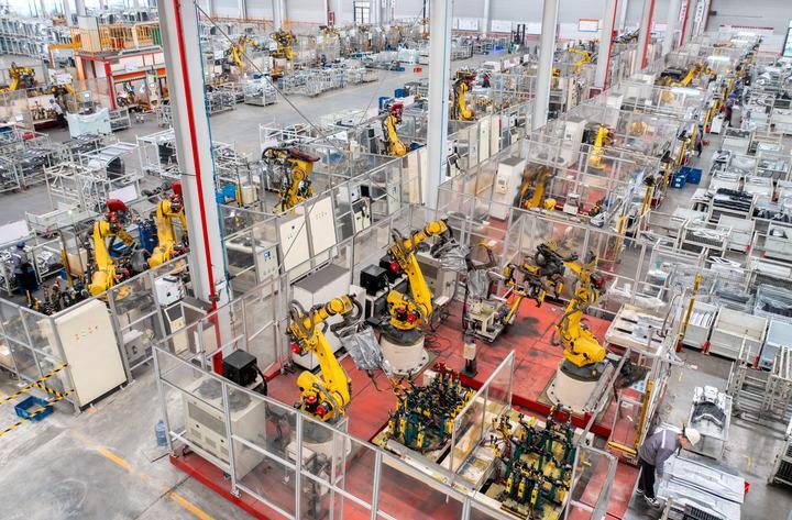2024年1月8日,在位于浙江省湖州市長(zhǎng)興經(jīng)濟(jì)技術(shù)開(kāi)發(fā)區(qū)的長(zhǎng)興地通汽車部件有限公司,全自動(dòng)機(jī)器人高速運(yùn)轉(zhuǎn)生產(chǎn)新能源汽車配件訂單產(chǎn)品(無(wú)人機(jī)照片)。新華社發(fā)(譚云俸攝)