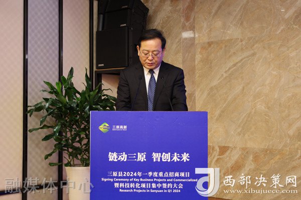 西部決策網(wǎng)訊 近日,“鏈動三原 智創(chuàng)未來”三原縣2024年一季度重點招商項目暨科技轉(zhuǎn)化項目集中簽約大會在咸陽市舉行。省市領(lǐng)導(dǎo)汪文展、李曉靜、吳進武、仝保亞、王春霄、程文杰、曾亞龍等出席活動??h委書記趙俊強致辭。縣委副書記、縣長楊紅剛主持??h委常委、常務(wù)副縣長蒙小衛(wèi)等介紹簽約項目情況。投資企業(yè)、項目單位負(fù)責(zé)人等100余人出席活動。