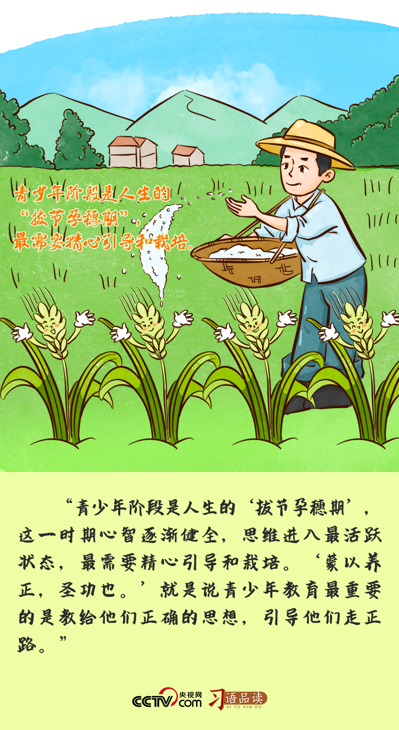 “拔節(jié)孕穗期”是禾谷類作物汲取養(yǎng)分、生長發(fā)育最快的階段,也是決定這一年收成多少的重要時期,需要農(nóng)人精心照料。處在人生“拔節(jié)孕穗期”的青少年階段,也是一個人一生中世界觀、人生觀、價值觀打底塑形的關鍵時期,正確的引導和悉心栽培至關重要。