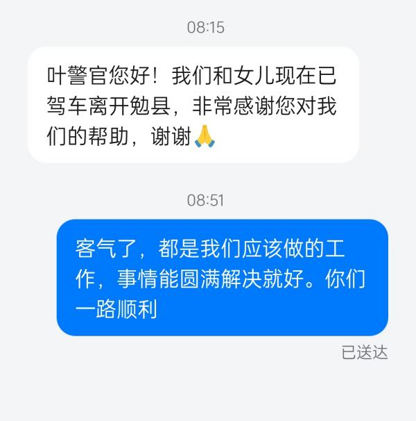 經(jīng)詢問,兩人是貴州貴陽人,其女兒饒某因家庭矛盾離家出走勉縣尋找網(wǎng)友嚴(yán)某,至今已失聯(lián)半個月。夫妻倆心急如焚,駕車從貴陽趕到勉縣,由于人生地不熟,便想到派出所尋求幫助。了解情況后,接警民警及時將指令下達(dá)給社區(qū)民警。社區(qū)民警會同警務(wù)助理及社區(qū)工作人員開展尋人工作,經(jīng)過不懈努力,終于在嚴(yán)某租住的民房內(nèi)找到饒某,并將其帶回派出所。