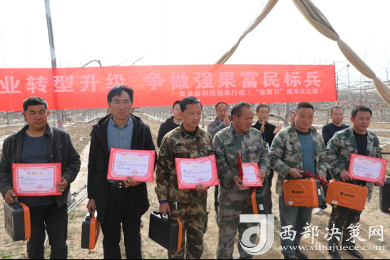 西部決策網(wǎng)訊 近日,黃龍縣果業(yè)中心、三岔鎮(zhèn)人民政府在三岔鎮(zhèn)木昌橋村聯(lián)合舉辦“金剪刀”技術(shù)大比武。本次比賽特邀請(qǐng)西北農(nóng)林科技大學(xué)園藝學(xué)院研究員,博士生導(dǎo)師,國(guó)家蘋果產(chǎn)業(yè)技術(shù)體系延安綜合試驗(yàn)站站長(zhǎng)鄒養(yǎng)軍,以及延安市和洛川縣等地的果業(yè)專家擔(dān)當(dāng)評(píng)委。來(lái)自全縣4個(gè)涉果鄉(xiāng)鎮(zhèn)的優(yōu)秀果農(nóng)代表11人以及果業(yè)中心技術(shù)員3人參賽。