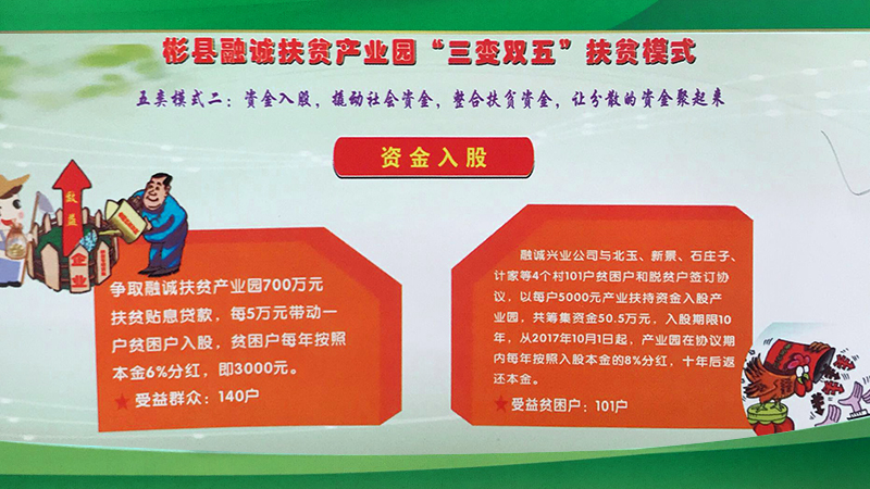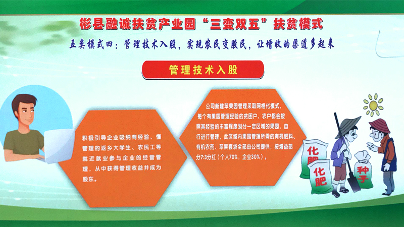 彬州融誠集團(tuán)公司按照“企業(yè)主導(dǎo)、政府搭臺(tái)、群眾參與、社會(huì)共建”的思路,圍繞主導(dǎo)產(chǎn)業(yè),緊盯市場需求和脫貧政策動(dòng)向, 在外出考察學(xué)習(xí)的基礎(chǔ)上,借鑒貴州省六盤水市“三變”改革的成功經(jīng)驗(yàn),以“資源變資產(chǎn)、資金變股金、農(nóng)民變股東”三變改革為基礎(chǔ), 探索總結(jié)出了符合融誠實(shí)際的“三變雙五”新模式。