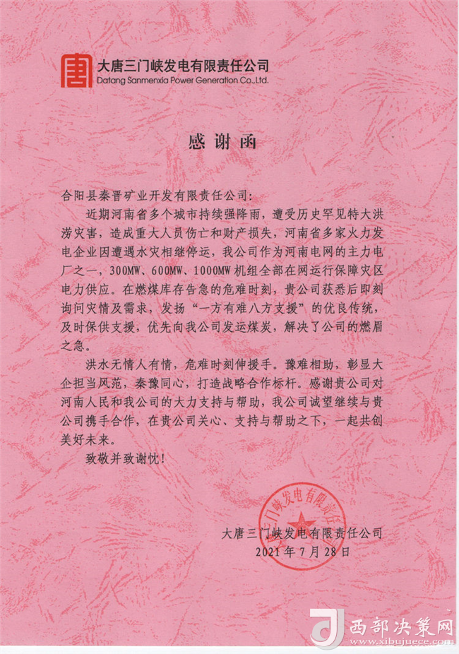 近日,大唐三門峽發(fā)電有限公司為秦晉集團(tuán)公司送來了感謝函,并將一面寫有“豫難相助,彰顯大企擔(dān)當(dāng)風(fēng)范,秦豫同心,打造戰(zhàn)略合作標(biāo)桿”的錦旗送到了秦晉集團(tuán)公司,對秦晉集團(tuán)“一方有難八方支援”的大愛精神表示感謝?。▓D/文:聶曉英)